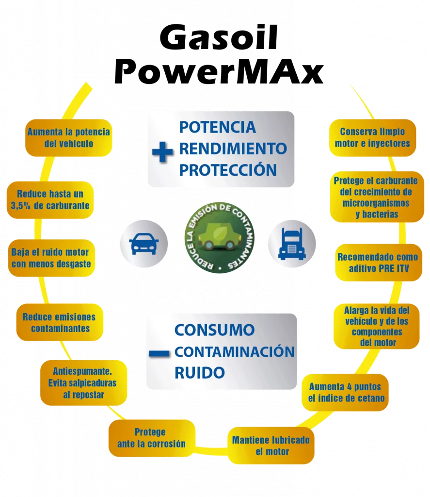 Gasoil PowerMAx es una nueva gama de carburantes con aditivos multifuncionales para vehículos diésel, tecnológicamente formulados para optimizar la potencia, el rendimiento y la protección de todo tipo de motores.